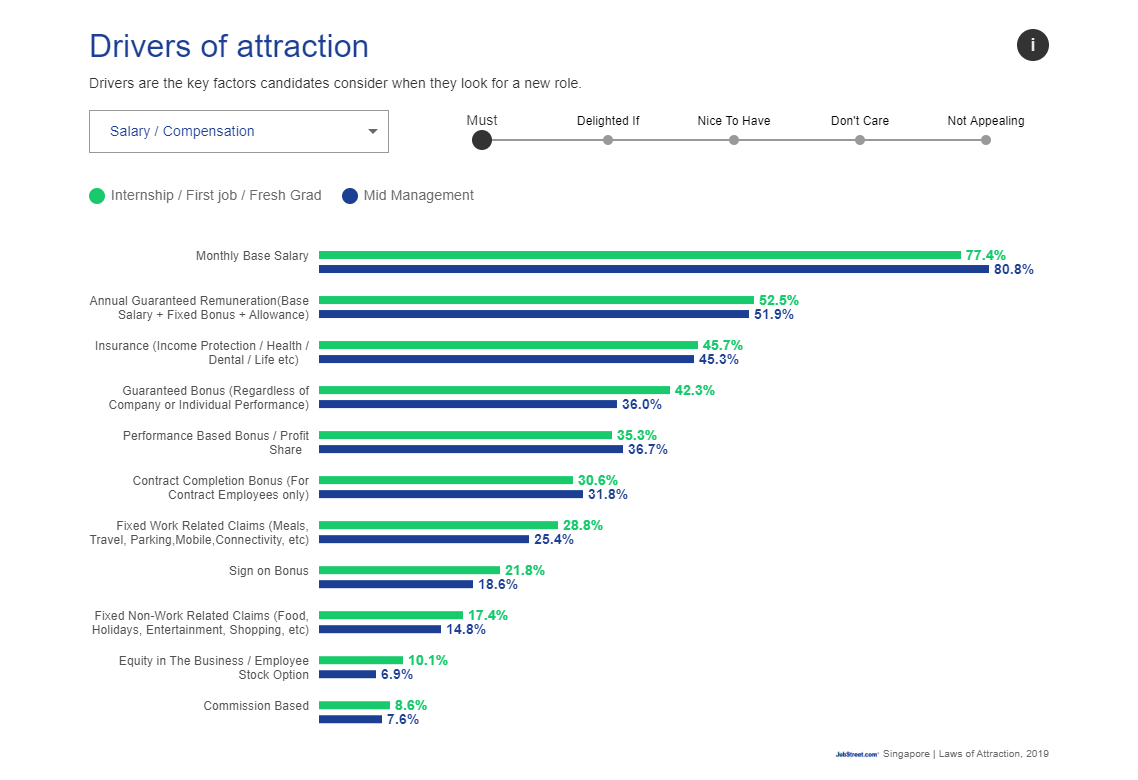 Using the same comparison between fresh graduates and middle managers for illustration, the two charts below show us that when it comes to salary and compensation considerations, both segments hold similar views with the monthly base salary being the primary driver of attraction. However, as can be seen from the second chart, the younger cohort are more concerned with job benefits such as additional leaves, whereas the more senior cohort are more interested in the medical benefits available for them and their families.