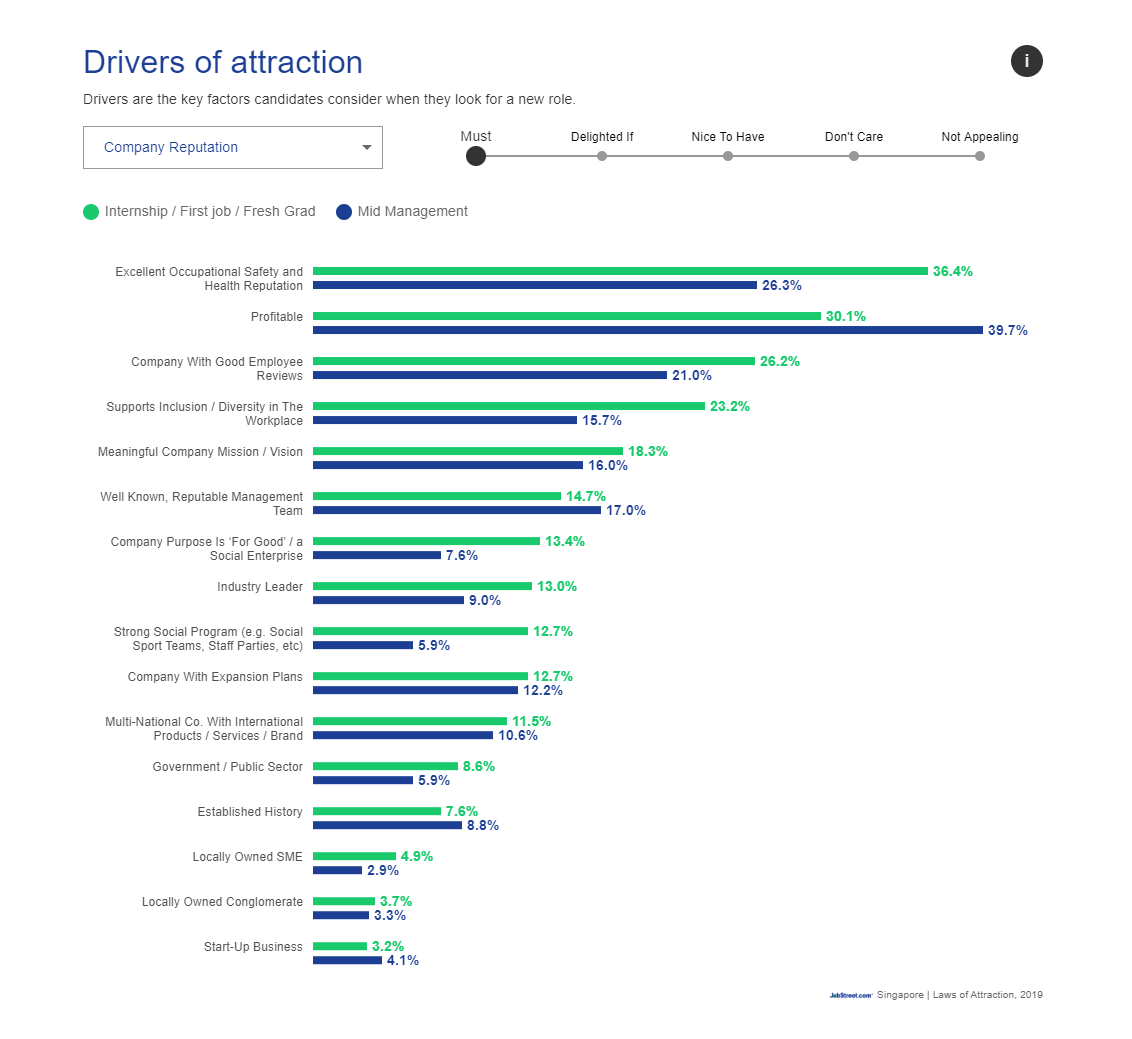 Companies should always be cognizant of public perceptions of the organisation's appeal, or lack thereof, as an employer. A positive brand perception among job seekers leads to the right candidates seeking for consideration even when actual vacancies are not immediately available. Drivers of attraction of the ideal employees should be a key influencing factor in how an organisation should shape its identity in the job market. While there are common drivers of influence across the board, companies should be mindful of the differences in mindset between candidate levels so as to better fine-tune its messaging for its primary talent segments.