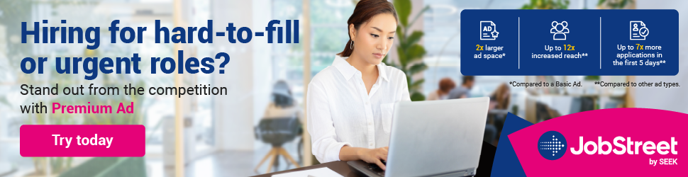 Here to Help You Hire In the war for talent, standing out from the crowd is crucial. For roles that need to be filled fast or roles that are hard to fill, Jobstreet’s premium ads can help companies with brand exposure. Compared to basic ads, premium ads give you up to 12 times increased reach and up to 7 times more applications in the first 5 days.