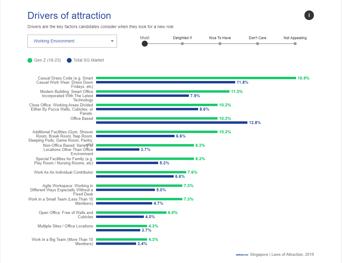 Young graduates are full of energy and up for all sorts of challenges thrown their way! That said, the last place they would want to work in is one that's dull, monotonous and uninspiring. Hiring companies can relate and resonate with young graduates better by creating a more positive and vibrant work environment, such as, by sprucing up the offices with mood-lifting decor and elements, or by incorporating segments of fun activities in-between the long working hours. Companies may also consider adopting a more casual dress code or incorporating features such as dress down Fridays to create a more relaxed work environment which appeals particularly well to the young workforce today, as seen in the following chart. On top of that, a smart office equipped with the latest technology will certainly help Gen Zers feel right at home too.