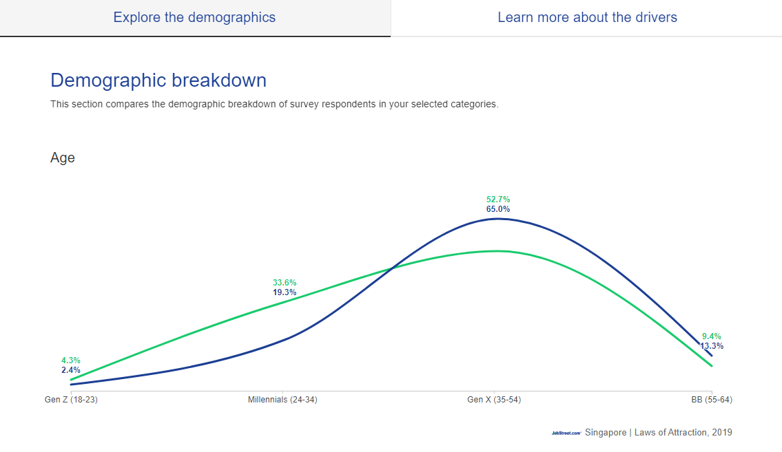 In general, young graduates are respectful, full of positive vibes, and bring with them elements of fun to an otherwise dull work environment. The unique traits of fresh graduates (as reflected in their workplace culture preferences shown in the chart below) as well as the motivations and drivers of more than 7,000 Singapore candidates across 20 industries in Singapore can be accessed anytime on Jobstreet.com's Laws of Attraction (LOA) portal here.