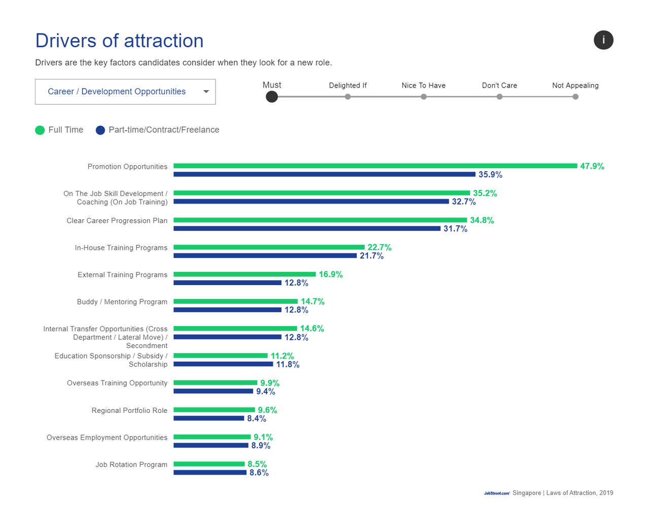 As we can see from the Laws of Attraction tool, Promotion Opportunities is a "Must"-have factor full-time candidates want in a job.