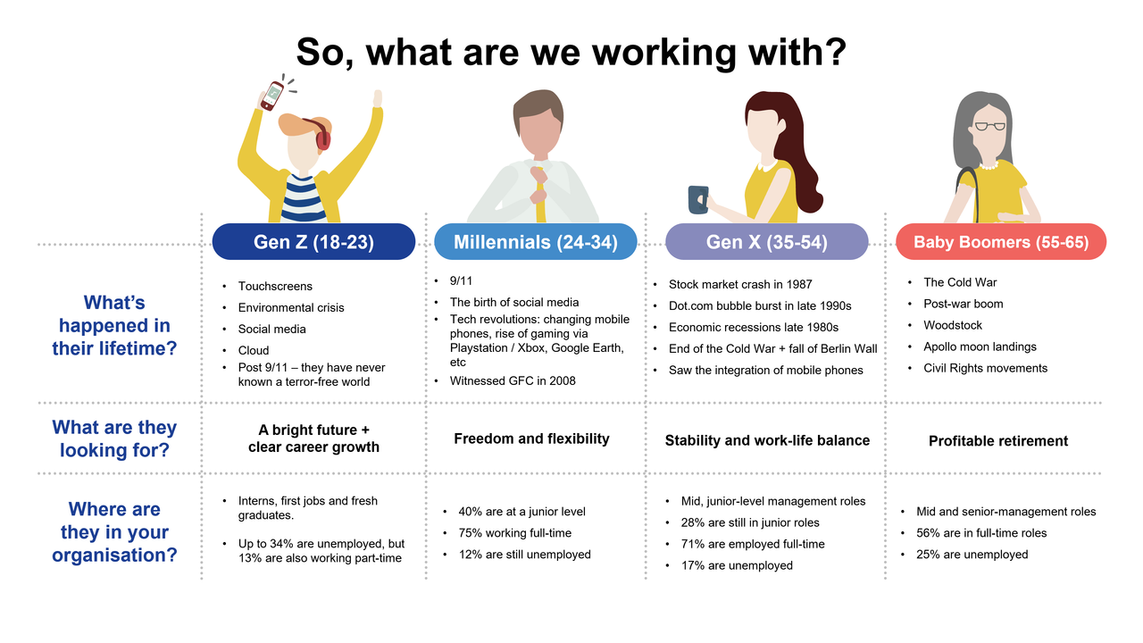 As for older generations, 1 in 4 Singaporean seniors are still part of the workforce – an increase of 14% from a decade ago – and with Singapore raising the age of retirement in 2030, it will become more common for a mixture of generations to be working together. It’s imperative that workplaces understand not just how to attract multigenerational talent, but to use insights to understand how these different generations can best work together.