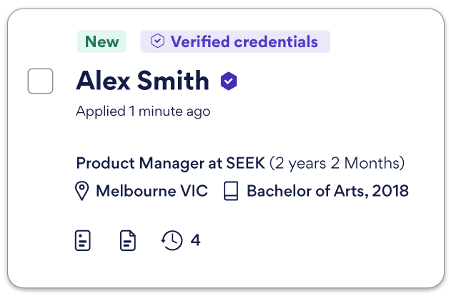SEEK Pass verifications help you hire with confidence, with credentials to validate work experience, identity, and residential status. There is more on the way! Stay tuned.
