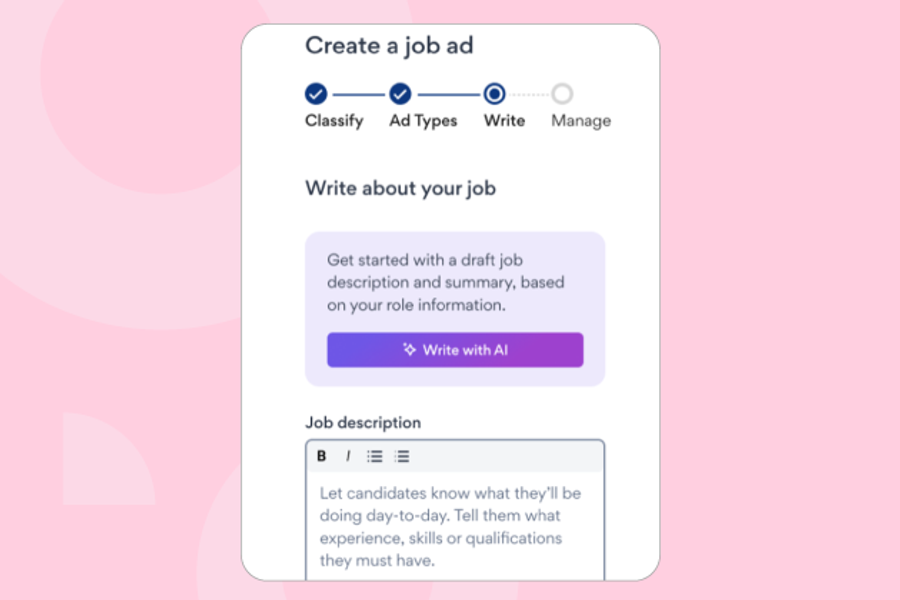 Ad writing can be time-consuming and challenging for hirers. That’s why we’ve leveraged SEEK’s market-leading job ad intelligence to develop our ‘Write with AI’ feature.